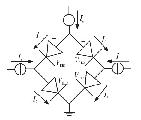 跨導線性電路的主要性能是借助于雙極性晶體管的跨導參數與其集電極電流成正比關系得到的。跨導參數與其集電極電流之間的比例關系為:在一個含有偶數個正向偏置發射結,且排列成順時針方向結的數目和反時針方向結的數目相等的閉環中,順時針方向發射電流密度之積等于反時針方向發射結電流密度之積。