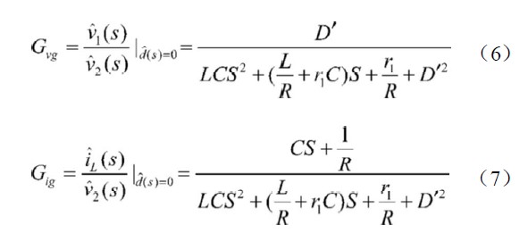 式中:V1 --高壓側(cè)輸出電壓穩(wěn)態(tài)值;V2 --低壓側(cè)輸入電壓穩(wěn)態(tài)值; iL^--電感電流擾動量; v2^--低壓側(cè)輸入電壓擾動量;D--靜態(tài)占空比;d--動態(tài)占空比。