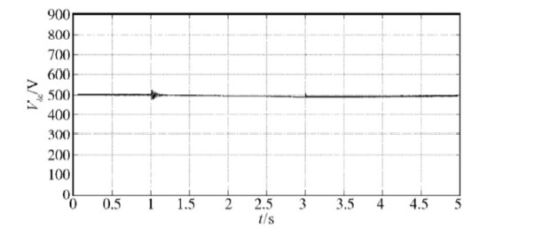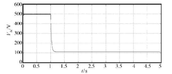 通過模擬擾動,使直流母線發(fā)生80%電壓暫降,電壓由510 V下降到200 V(圖16)。圖17示出在直流母線上并聯(lián)超級電容電壓暫降抑制裝置后的直流母線電壓波形。