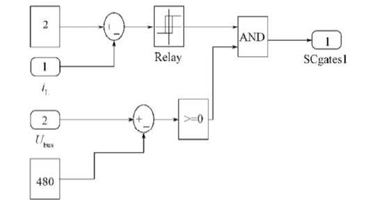 直流母線工作在正常電壓范圍內(nèi),當(dāng)超級電容器陣列電壓低于額定工作電壓時,對超級電容器進行充電,其充電控制框圖如圖6 所示。通過實際充電電流與參考充電電流的滯環(huán)比較及對最大開關(guān)頻率的限制,產(chǎn)生信號控制恒流充電。恒流充電有利于對儲能裝置的保護,且動態(tài)響應(yīng)較快。