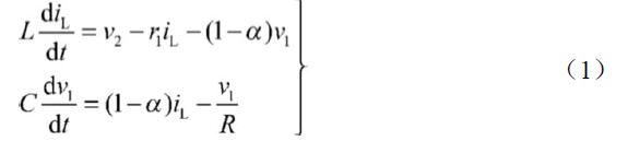 式中:v1--高壓側(cè)輸出電壓;v2--低壓側(cè)輸入電壓;α --時間系數(shù),相當(dāng)于占空比,α =ton÷(toff+ton);iL --電感電流;R--限流電阻;L--充放電電感量;C--超級電容容量;r1 --電容器內(nèi)阻。