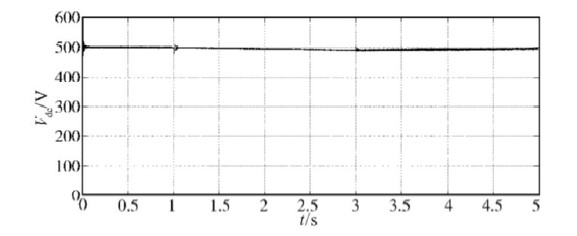 圖18示出發(fā)生20%電壓暫降(即直流母線由510 V下降到400 V左右)時直流母線電壓波形。并聯(lián)超級電容電壓暫降抑制裝置后,直流母線電壓得到了較好的支撐,其電壓波形如圖19 所示。