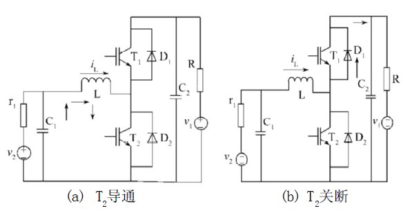 開關(guān)T2處于恒脈寬調(diào)制方式下,雙向DC-DC變換器主電路Boost 模式下等效電路如圖4 所示。當(dāng)T2 導(dǎo)通時(圖4(a)),電源v2向電感L充電,電能轉(zhuǎn)化為磁能存儲于L中,同時電容C2向v1供電;當(dāng)T2關(guān)斷時(圖4(b)),電感L釋放磁能向v1 供電。電感L的儲能作用能使電壓泵升,通過電容C2 穩(wěn)壓之后,可使輸出電壓高于輸入電壓。