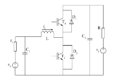 雙向DC-DC變換器的主電路結(jié)構(gòu)如圖3所示。通過控制開關(guān)T1和T2,達到雙向直流升壓與降壓的目的。在升壓運行時,T2動作,T1截止,變換器工作在Boost狀態(tài);當(dāng)T1動作,T2截止時,變換器工作在Buck狀態(tài),實現(xiàn)降壓功能。