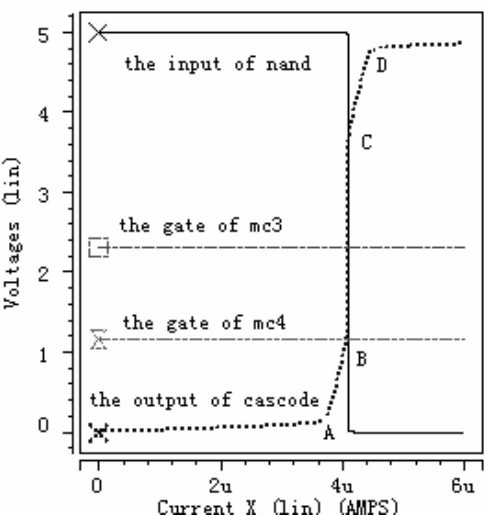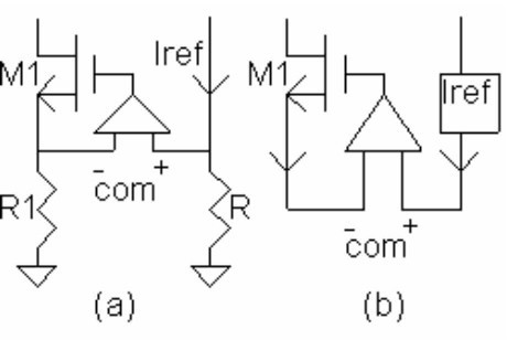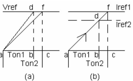 傳統的開關電源控制電路中, 電流極限比較器結構如圖1(a)所示, 檢測電流由M1( sense MOSFET)流入由多個開關管和電阻組成的網絡R1 中,該網絡通過控制開關管導通或關斷, 改變R1 的電阻值, 得到不同的占空比。另外一基準電流流過一阻值固定的電阻R, 產生一固定參考電壓。當R1 的壓降隨檢測電流上升到參考電壓時, 比較器關斷功率管, 保證輸出電壓穩定。其工作原理如圖2(a) 所示,例如: R1 上的電壓從a 上升到d, 從而關斷功率管產生一占空比, 當改變R1 的電阻值, R1 上的電壓從a 上升到f 得到另一占空比。從圖1(a)可以看出:傳統的開關電源電流極限比較器是將兩種電流先轉化成電壓再進行比較, 需要占芯片面積非常大的電阻網絡和開關管, 并且為保證電阻精度, 一般需要激光修調技術, 這大大增加了芯片成本。因此本文在此基礎上提出一種新型的電流極限比較器結構。