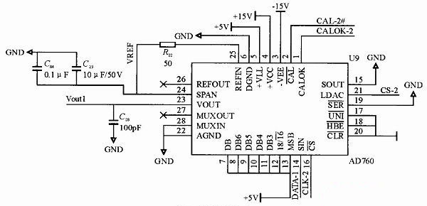 D/A轉(zhuǎn)換采用ADI公司的AD760芯片,如圖2所示是D/A轉(zhuǎn)換電路圖。AD760是一款16/18位可選、可進(jìn)行自校準(zhǔn)的DAC,內(nèi)置片內(nèi)基準(zhǔn)電壓源、雙緩沖鎖存器和輸出放大器。它采用ADI公司BiMOSII工藝制造,可以在同一芯片上實(shí)現(xiàn)高精度雙極性線性電路與低功耗CMOS邏輯功能。只需發(fā)送脈沖使CAL引腳變?yōu)榈碗娖,便?huì)啟動(dòng)自校準(zhǔn)功能。CALOK引腳會(huì)顯示何時(shí)順利完成校準(zhǔn)。校準(zhǔn)期間,可以利用輸出多路復(fù)用器(MUXOUT)將輸出發(fā)送至輸出范圍底部。數(shù)據(jù)可以采用標(biāo)準(zhǔn)二進(jìn)制、串行數(shù)據(jù)或雙8位字節(jié)格式載入AD760.在串行模式下,可以使用16位或18位數(shù)據(jù);串行模式輸入格式通過引腳選擇,可以是MSB優(yōu)先或LSB優(yōu)先。通過具有雙重功能的三個(gè)數(shù)字輸入引腳(引腳12、13和14)來實(shí)現(xiàn)。在字節(jié)模式下,用戶同樣可以定義優(yōu)先加載高字節(jié)還是低字節(jié)數(shù)據(jù)。雙緩沖鎖存結(jié)構(gòu)不僅可以消除數(shù)據(jù)偏斜誤差,還能夠在多DAC系統(tǒng)中同時(shí)更新各DAC.當(dāng)CLR選通時(shí),可以利用異步CLR功能將輸出清零至負(fù)滿量程或中量程,具體取決于引腳17的狀態(tài)。
