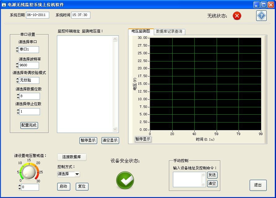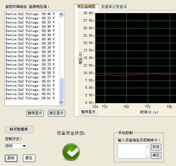 它實現的主要功能有:通過串口接收ZigBee 無線網絡傳來的被監控電源的電壓數據,將該數據分別以文本及波形圖的方式實時顯示出來;設置電壓警戒值及控制方式等,實現電源電壓無線監控系統的自動或手動控制;通過連接后臺數據庫,將電壓及報警信息儲存在數據庫中,方便在上位機界面上對報警記錄的查詢和日后對監控數據信息的管理等[8].