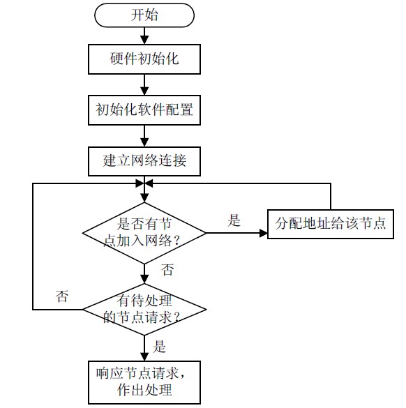 協調器在系統中的作用是,建立并管理ZigBee網絡,自動允許其他節點加入網絡的請求,收集終端節點傳來的電壓數據,并通過串口將數據發送給上位機,同時接收上位機的控制命令,再將命令發送給終端節點控制其采取相應的處理措施。協調器建立網絡并處理節點請求的程序流程如圖3 所示。