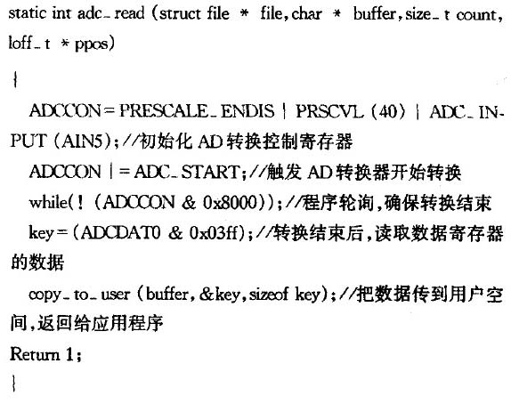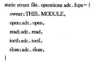 系統(tǒng)內(nèi)部,I/O設(shè)備的存取使通過一組固定的入口點來進行的。這組入口點由特定設(shè)備的設(shè)備驅(qū)動程序提供,在數(shù)據(jù)結(jié)構(gòu)file_operatiONs()中定義。該程序定義了一個數(shù)據(jù)結(jié)構(gòu)為file_operations()的變量adc_fops。