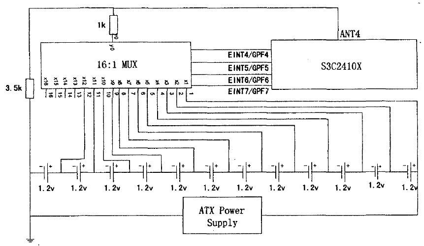 監(jiān)測系統(tǒng)利用S3C2410x自帶的AD轉(zhuǎn)換器將模擬電壓輸入轉(zhuǎn)換為應(yīng)用程序所需要的數(shù)據(jù)。芯片自帶AD轉(zhuǎn)換器為8路模擬輸入、10bit數(shù)字輸出,最大轉(zhuǎn)換率為500ksps,轉(zhuǎn)換時鐘為2.5MHz,模擬輸入范圍為0-3.3V.本系統(tǒng)所需要監(jiān)測的電壓范圍為0~14。