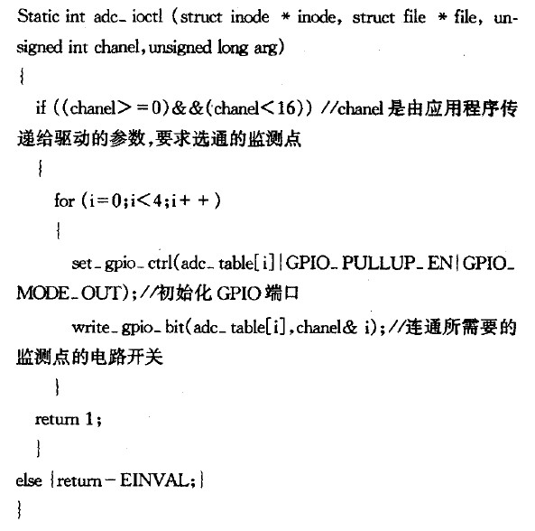 控制外圍的輔助電路時調(diào)用adc_iocd()函數(shù)。對照監(jiān)測點邏輯控制表,從S3C2410x的GPIO端口發(fā)出選擇指令,接著就可以進行讀操作以讀取相應(yīng)的數(shù)值。在不需要監(jiān)測時,控制監(jiān)測系統(tǒng)進入省電模式。