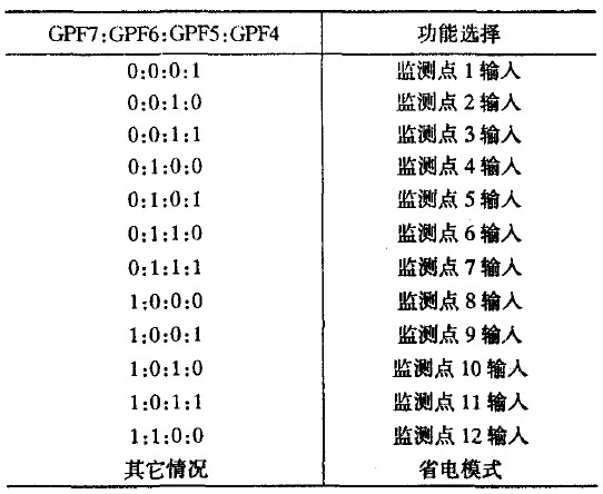 利用S3C2410x的GPIO端口控制選通多路門開關(guān)電路,監(jiān)測系統(tǒng)可以隨機地提取不同監(jiān)測點的電壓值。選通邏輯通過譯碼實現(xiàn),如表1所示。