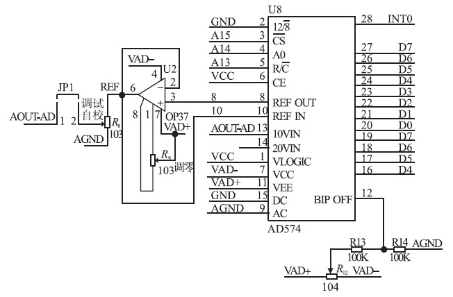 A/ D 采樣輸入電路如圖4 所示。為了滿足取樣精度需要,我們選擇12 bit A/ D 轉換器和12 bitD/ A 轉換器,使步進小于1 mA,在電路中A/ D 啟動后,先讀高8 位結果,再讀后4 bit;D/ A 是先寫入高8 bit,再寫入低4 bit.