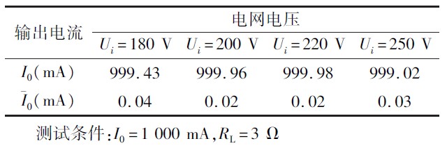 電源穩定度測試數據如表1 所示。其中電源穩定度是指在容許電網波動范圍條件下,對輸出電流穩定度的影響。測試條件為I0 =1 000 mA,RL =3Ω,測試數據表明電網電壓在180 V ~250 V 波動時,輸出電流最大偏差為0.99 mA,紋波電流小于0.05 mA,輸出電流和紋波電流均達到設計要求。