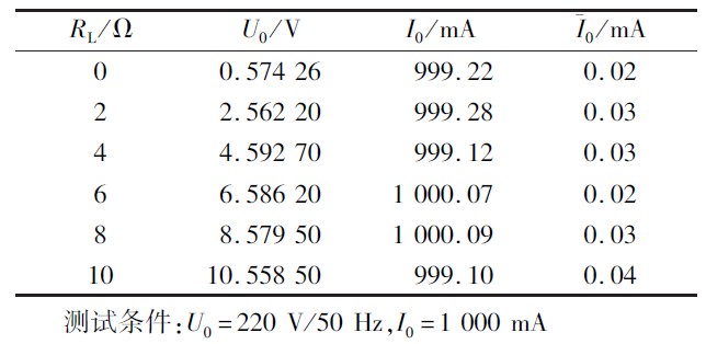 負載穩定性測試條件為U0 =220 V/50 Hz,I0 =1000 mA,測試數據如表2 所示,其中負載穩定度是指一定的工作情況下,負載變化引起的輸出電流變化。測試數據表明負載在0 ~10 贅變化時,輸出電流最大偏差為0. 99 mA,紋波電流小于0. 05 mA.