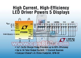 LTC3208 范圍為 2.9V 至 4.5V 的輸入電壓為單節(jié)鋰離子蜂窩應(yīng)用而優(yōu)化。當用鋰離子電池(標稱值為 3.6V)驅(qū)動時,效率達到 95%,同時靜態(tài)電流僅為 250uA,從而最大限度地延長了電池工作時間。LTC3208 僅需要 4 個小型的電容器和一個電阻,就可組成占板面積微小的低矮(< 34mm2,高 0.75mm)解決方案,能為 5 個獨立顯示屏使用的所有 LED 供電。