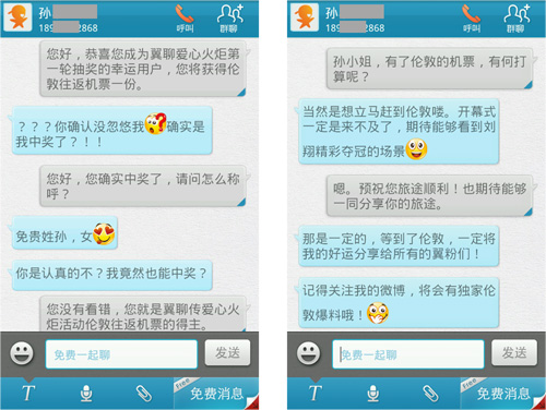 自翼聊愛心火炬傳遞活動上線以來,其公益性質受到了社會各界人士的關注。目前,翼聊愛心火炬傳遞人次已經突破200萬。就此,為了回報各方愛心人士的積極參與,迎接倫敦奧運,以及激勵用戶繼續推動下一波愛心火炬傳遞熱潮,翼聊官方已于近日開獎,趕在倫敦奧運開幕前送出第一張倫敦奧運往返機票大獎。
