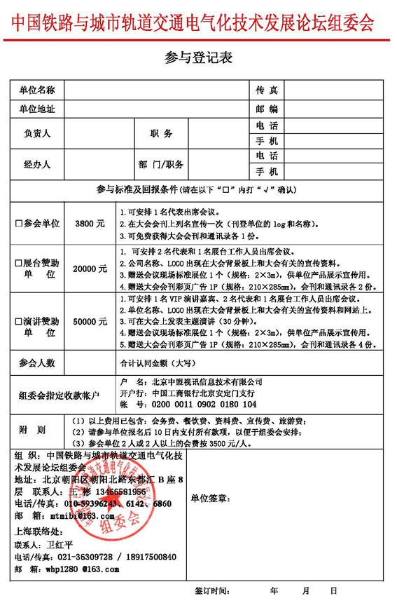 承辦:《高速鐵路與軌道交通》雜志北京中盟視訊信息技術有限公司支持媒體:《高速鐵路與軌道交通》雜志《今日軌道交通》雜志《中國鐵路與城市軌道交通采購大黃頁》中國高速鐵路產業網中國鐵路網中國城市軌道交通網