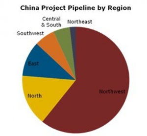 此外,國內市場也是眾多中國廠商下半年的重點。根據Solarbuzz的統計,中國大陸光伏項目儲備已經達到35GW(圖二),其中有61%位于西北地區。甘肅、青海、新疆等西北部省份的地面安裝項目和江蘇、浙江等東部省份的屋頂安裝項目都有望在今年的國內市場上占有重要份額。