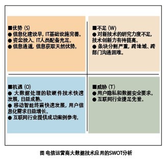 因此,應(yīng)用大數(shù)據(jù)技術(shù)解決當(dāng)前的各種挑戰(zhàn),對電信運營商有著重要意義。在此過程中電信運營商面臨著什么樣的機遇和挑戰(zhàn)?可利用SWOT方法(如圖所示)探知。