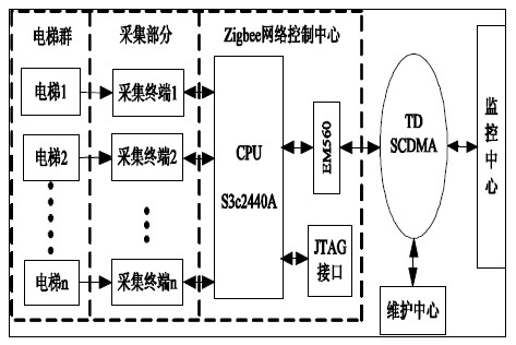 伴隨著城市經(jīng)濟(jì)的迅猛發(fā)展,電梯作為一種垂直交通工具,它的應(yīng)用日益廣泛。然而電梯的故障檢測和及其維護(hù),特別是電梯遠(yuǎn)程監(jiān)控的作用就顯得極為重要。但是國內(nèi)在用的大多數(shù)電梯由于不能及早的預(yù)測電梯的運(yùn)行故障而常常出現(xiàn)電梯困人、蹲底、沖頂、溜梯等突發(fā)情況。經(jīng)研究發(fā)現(xiàn),罪魁禍?zhǔn)资请娞輧?nèi)各種待測信號(hào)繁多,不便于布線且目前常用的2.5G 傳輸網(wǎng)絡(luò)不能滿足大量數(shù)據(jù)傳輸?shù)男枨蟮仍颉R虼耍芯坎㈤_發(fā)基于zigbee 技術(shù)+3G 傳輸網(wǎng)絡(luò)的多電梯遠(yuǎn)程監(jiān)控系統(tǒng)具有很大的工程實(shí)際意義。