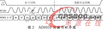 AD9959的串行工作模式都工作于寄存器級(jí)傳輸,而不是字節(jié)級(jí)傳輸。但是AD9959提供的SYNC I/O功能可以中斷I/O操作,這種模式可以使寄存器的某個(gè)字節(jié)進(jìn)行設(shè)置,從而減少了設(shè)置時(shí)間。所有指令都是在SCLK的上升沿寫入,而在SCLK的下降沿讀出的。在本文所設(shè)計(jì)的雷達(dá)信號(hào)源中,對(duì)于AD9959的控制模式采用了Single--Bit Serial 2-wire Mode,在這種工作模式下,AD9959使用SDIO 0作為數(shù)據(jù)傳輸管腳,要使AD9959工作于這種模式,可以將CSR寄存器中的CSR<2:1>設(shè)置為00即可。在Single-Bit Serial 2-wire Mode傳輸模式下,支持MSB優(yōu)先和LSB優(yōu)先兩種模式。