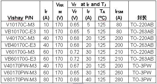 新器件采用一種雙中心抽頭的配置形式,包括10A V10170C和VB10170C,40A V40170C、VB40170C和V40170PW,60A V60170G、VB60170G和V60170PW,以及80A V80170PW。