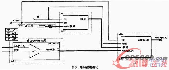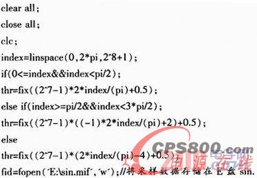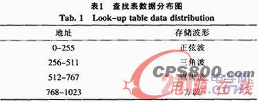 通過對(duì)DDS基本原理的分析得知只需更換波形存儲(chǔ)器中的波形采樣數(shù)據(jù),就可以得到所需波形的信號(hào)。波形數(shù)據(jù)存儲(chǔ)方式包括順序存儲(chǔ)方式和間隔存儲(chǔ)方式,本設(shè)計(jì)采用順序存儲(chǔ)方式將方波,三角波,正弦波,鋸齒波4種波形采樣數(shù)據(jù)全部依次存儲(chǔ)在一個(gè)查找表里,數(shù)據(jù)分布情況如表1所示。通過改變尋址首地址,并在該波形數(shù)據(jù)存儲(chǔ)地址范圍內(nèi)循環(huán)尋址,從而實(shí)現(xiàn)對(duì)所需信號(hào)波形的輸出。具體實(shí)現(xiàn)方法在累加控制模塊中有介紹。
