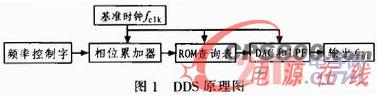DDS信號(hào)發(fā)生器是由:頻率控制字、相位累加器、ROM表、D/A轉(zhuǎn)換器以及模擬低通濾波器LPF組成,原理框圖如圖1所示。