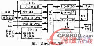 本設(shè)計(jì)在Altera的EP2C35F672C8芯片的基礎(chǔ)上,在SOPCBuilder和OuartusⅡ開發(fā)環(huán)境下,利用SOPC技術(shù),在FPGA中集成Altera的嵌入式軟核處理器NiosⅡ和其他外設(shè),將硬件系統(tǒng)與軟件集成在單一可編程芯片中,從而實(shí)現(xiàn)片上的系統(tǒng)級(jí)設(shè)計(jì)。系統(tǒng)框圖如圖2所示,由DDS基本單元(由頻率控制字,相位累加器,ROM,DAC,LPF構(gòu)成),F(xiàn)PGA外部硬件資源(撥扭開關(guān)SWTCH、鍵盤KEY、LCD12864)和NiosⅡ處理器系統(tǒng)等構(gòu)成了基本電路。四位撥扭開關(guān)選擇輸出波形,鍵盤控制輸出波形信號(hào)頻率,LCD12864顯示波形信號(hào)參數(shù),各硬件模塊之間的協(xié)調(diào)工作通過NiosⅡ微處理器在圖形化開發(fā)環(huán)境NiosⅡIDE下用C語言來編程實(shí)現(xiàn)控制。