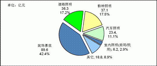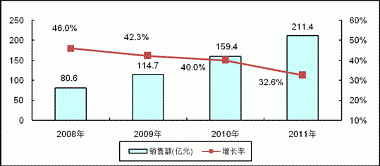 隨著國家政策的大力推動,制造成本的下降和發(fā)光效率等技術的不斷突破,LED對傳統(tǒng)照明市場的替代效應極大激發(fā)了半導體照明市場的需求。2011年,中國半導體照明市場規(guī)模為211.4億元,同比增長32.6%。半導體照明替代傳統(tǒng)照明而產(chǎn)生的市場空間巨大,這使得未來幾年中國半導體照明市場都將保持高速平穩(wěn)的增長態(tài)勢。