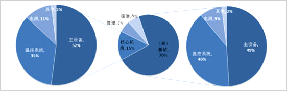 基于中國通信行業節能減排、構建綠色通信的需求,對其進行網絡實際能耗分析,整個通信網絡能耗狀況呈現出如圖1所示。從圖1可以看出,通信主設備的能耗占總能耗的50%左右,除主設備外,溫控系統和電源損耗是能耗的關鍵部分。由于網絡業務演進快,主設備搬遷周期短,耗能的主設備已經被節能設備取代,而電源損耗約占整個網絡能耗的10%,在新建和擴容站點、機房部署高效電源以及普通電源的高效化改造后,能夠減少60%的能量轉換損失。高效電源熱量釋放少,溫控系統部署隨之減少,其能耗亦可得以降低。綜合看來,僅電源系統高效化這項舉措就能降低整個網絡能耗6%至7%。