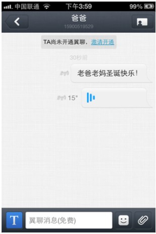 狂歡:公務纏身、飛機晚點,不必擔心你會錯過圣誕狂歡。一眾好友歡慶時,翼聊多方電話將把那些錯過聚會的友人接納進來,不管你在哪里,不管你此刻是否孤單,歡樂的氣氛同樣將包裹著你。
