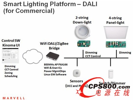 目前,Marvell LED照明市場的劃分策略是室內照明和商業照明兩部分。Lance對LED室內照明市場發展趨勢提出了3點預測:首先,得益于LED燈具價格的不斷下降,2014-2015年LED照明將會進入爆發式增長階段。其次,整個市場將從非調光轉到調光。最后,無線可調光LED燈出現。