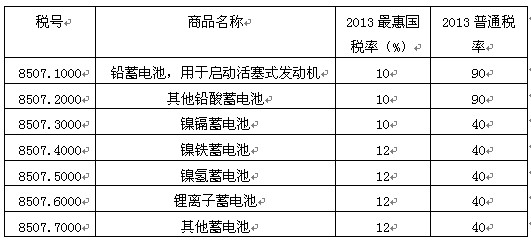 2013年我國鉛蓄電池進口關稅如下: