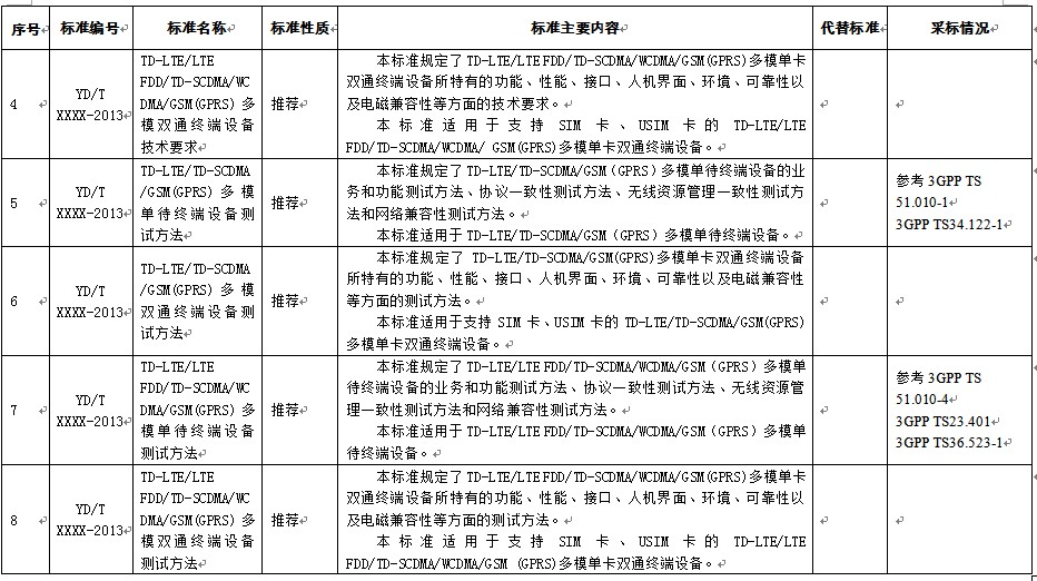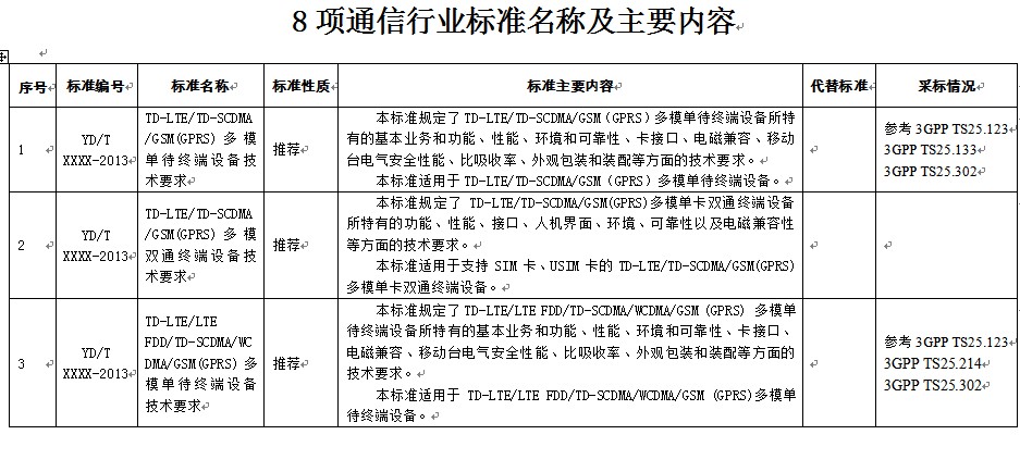 根據工信部標準化工作安排,相關標準化技術組織完成了《TD-LTE/TD-SCDMA/GSM(GPRS)多模單待終端設備技術要求》等8項通信行業標準的編制工作(標準名稱及主要內容等見附件)。為進一步聽取社會各界意見,現予以公示,截止日期2013年6月23日。如有不同意見,請在公示期間將意見發送至biaozhungongshi@miit.gov.cn信箱(郵件主題標為“《TD-LTE/TD-SCDMA/GSM(GPRS)多模單待終端設備技術要求》等8項通信行業標準報批稿公示意見反饋”)。