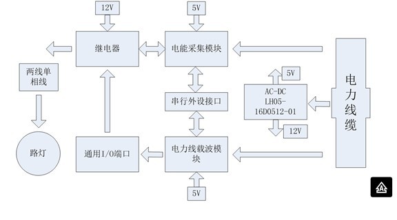 路燈控制器硬件系統包括電力線載波數據傳輸功能、電能采集功能、繼電器功能、AC/DC電源等。路燈控制器直接從5芯3相電纜接入,電力線載波模塊接在指定的相位上,電能采集部分和繼電器高壓部分與路燈所在相電力 線連接,實現了信號的傳輸和路燈的控制。