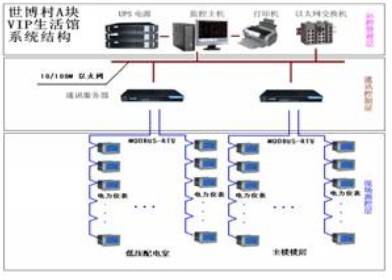 由于該項目是五星級酒店,現場需要監測所有安裝智能儀表的回路,并且需對空調、照明、動力用電進行分類統計,并且該統計報表需每天自動生成,現場設備運行狀態包括回路合分閘狀態也需實時顯示,F場儀表眾多,采用了3個串口服務器加交換機的組網方式。