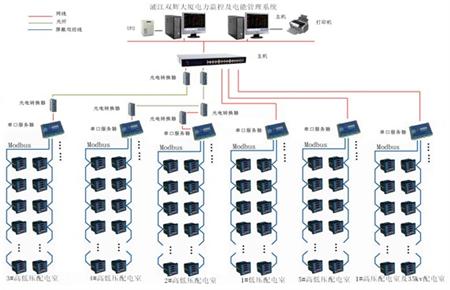 各智能電力儀表通過屏蔽雙絞線RS485接口,采用MODBUS通訊協(xié)議總線型連接接入通訊服務(wù)器。然后35kv配電室、1#配電室高低壓部分和5#配電室高低壓部分通過網(wǎng)線直接與值班室的工業(yè)交換機(jī)相連, 3#高低壓部分通過光纜直接與值班室的工業(yè)交換機(jī)相連,4#高低壓部分通過光纜先連到2#配電室,再和2#高低壓部分一起通過光纜一起連到值班室的工業(yè)交換機(jī)。最后工業(yè)交換機(jī)通過網(wǎng)線連到值班室的兩臺主機(jī)。