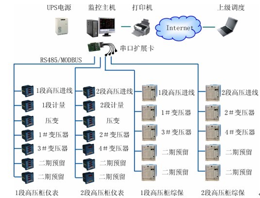 站控管理層針對(duì)電力監(jiān)控系統(tǒng)的管理人員,是人機(jī)交互的直接窗口,也是系統(tǒng)的最上層部分。主要由系統(tǒng)軟件和必要的硬件設(shè)備,如工業(yè)級(jí)計(jì)算機(jī)、打印機(jī)、UPS電源等組成。監(jiān)測(cè)系統(tǒng)軟件具有良好的人機(jī)交互界面,對(duì)采集的現(xiàn)場(chǎng)各類(lèi)數(shù)據(jù)信息計(jì)算、分析與處理,并以圖形、數(shù)顯、聲音等方式反映現(xiàn)場(chǎng)的運(yùn)行狀況。