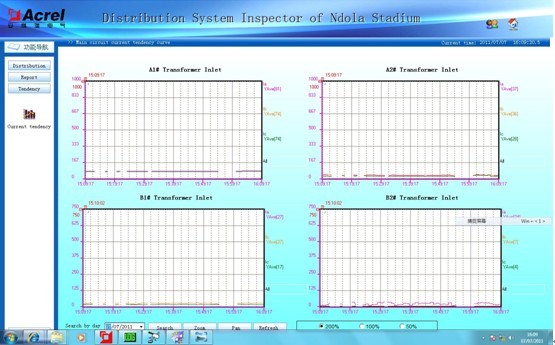 體育場的主要用電負荷為照明和應急照明,約占到總負載的70%,其中以金鹵燈為主的場地照明占到照明負荷的60%。除照明外最大的負荷是電子大屏。援贊比亞恩多拉體育場電力監控系統為Acrel-2000型。本系統涉及回路共112個,配電柜上安裝的儀表為上海安科瑞ACR系列及PZ系列多功能電力儀表。