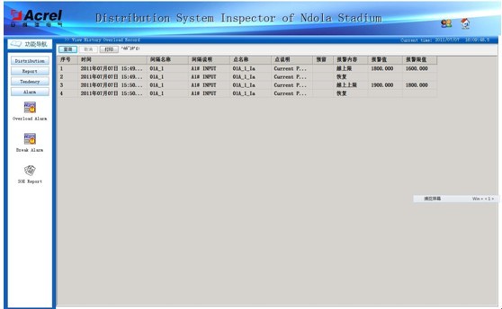 電力監控系統為整個體育場低壓配電系統運行狀態的監測提供了一套完整的解決方案,通過計算機界面反映給值班員和系統管理人員。系統軟件采用全英文界面,通過界面左側的樹形按鍵菜單進行畫面切換操作。其中報警功能只對中國留守人員開放,故該功能界面設定成中文。本系統的具體功能如下: