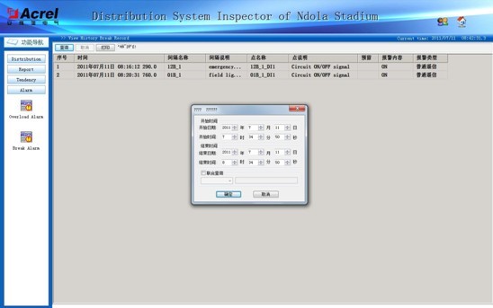 根據設計意圖,在體育場的低壓配電系統中,商鋪和舞臺演出部分都需要做電能計量,要求電力監控系統能具有一定的電能管理功能。本系統提供給客戶一個能查詢電能報表并打印的界面,提供用戶查詢時間的自定義選擇然后生成電度計量報表,完成對進線回路、商鋪回路和演出回路的電度計量。