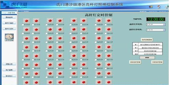 本系統(tǒng)實(shí)現(xiàn)對(duì)虎門港碼頭32桿高桿燈(64只燈泡)進(jìn)行遠(yuǎn)程定時(shí)及手動(dòng)控制,在正常情況下,系統(tǒng)將會(huì)按照管理員所設(shè)定時(shí)間對(duì)高桿燈自動(dòng)進(jìn)行點(diǎn)亮及熄滅操作,提高了碼頭照明的及時(shí)性、同步性、合理性;同時(shí)系統(tǒng)還具有遠(yuǎn)程手動(dòng)控制,避免了因天氣多變帶來(lái)的碼頭照明問(wèn)題,提高了操作的靈活性,大大降低了電能的浪費(fèi),保證了資源的合理利用。圖3為高桿燈控制畫面。