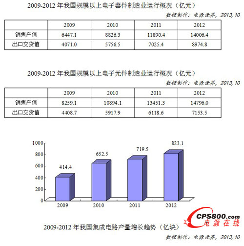 在過去4年,我國電子元器件產業取得了快速穩定的增長。截止2012年底,我國電子器件和電子元件的銷售產值分別由2009年的6447.1億元、8259.1億元增長到14006.4億元、14796億元,漲幅分別達到117.3%和79.1%,各自平均年復合增長率為29.3%、19.8%。