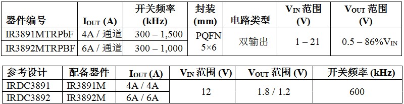 全新雙輸出器件對5V到12V輸入、1V到21V輸入 (使用5V外偏置) 單電源軌操作進(jìn)行了優(yōu)化。IR3891和IR3892采用了纖巧的5×6mm PQFN封裝,在165mm2的小巧占位面積內(nèi),分別為需要4A/通道或者6A/通道的應(yīng)用帶來極為緊湊的解決方案。