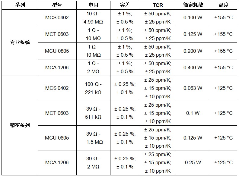 專業系列器件具有良好的高溫性能,在70℃下的額定耗散功率達到400mW,工作溫度可達+155℃。精密系列器件具有非常好的穩定性,容差低至±0.1%,TCR低至±10ppm/K。