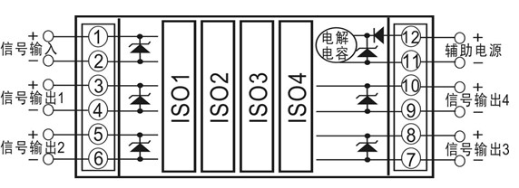 例2: 輸入:4-20mA;輔助電源:24V;輸出1:4-20mA;輸出2:4-20mA;輸出3:4-20mA;輸出4:4-20mA。