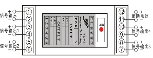 例1: 輸入:0-5V;輔助電源:12V;輸出1:0-5V;輸出2:0-5V;輸出3:0-5V;輸出4:0-5V。