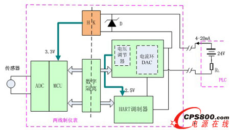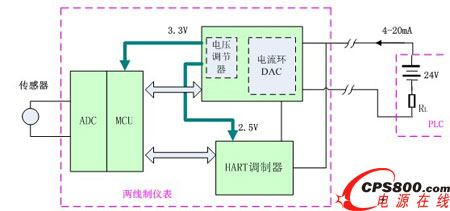 圖一的電路中,傳感器的信號(hào)經(jīng)過ADC轉(zhuǎn)換成數(shù)字信號(hào),再經(jīng)MCU發(fā)送給電流環(huán)DAC及HART調(diào)制器,形成4-20mA的信號(hào)輸出,電流環(huán)DAC從PLC輸出的4-20mA總線上取電,經(jīng)內(nèi)置的電壓調(diào)節(jié)器輸出3.3V及2.5V,給MCU及HART調(diào)制器提供少量的電源。